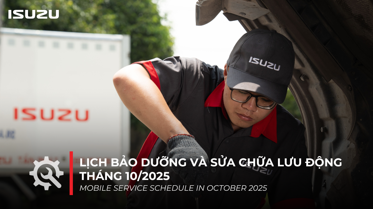 Nhằm tri ân khách hàng đã tin dùng sản phẩm cùng với mong muốn được đồng hành và chăm sóc cho xe được vận hành trong điều kiện hoàn hảo nhất. ISUZU Việt Nam xin gửi đến Quý Khách hàng lịch trình tổ chức chương trình “Sửa chữa và bảo dưỡng lưu động” trong tháng 10 năm 2025.