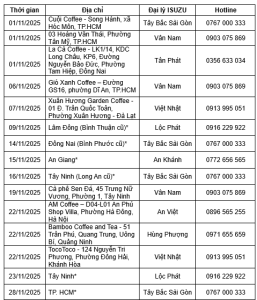 Hãy lưu lại lịch sự kiện Trưng bày & Lái thử xe tháng 11 – 2025 của ISUZU dưới đây và liên hệ với hotline của Đại lý để biết thêm thông tin chi tiết!